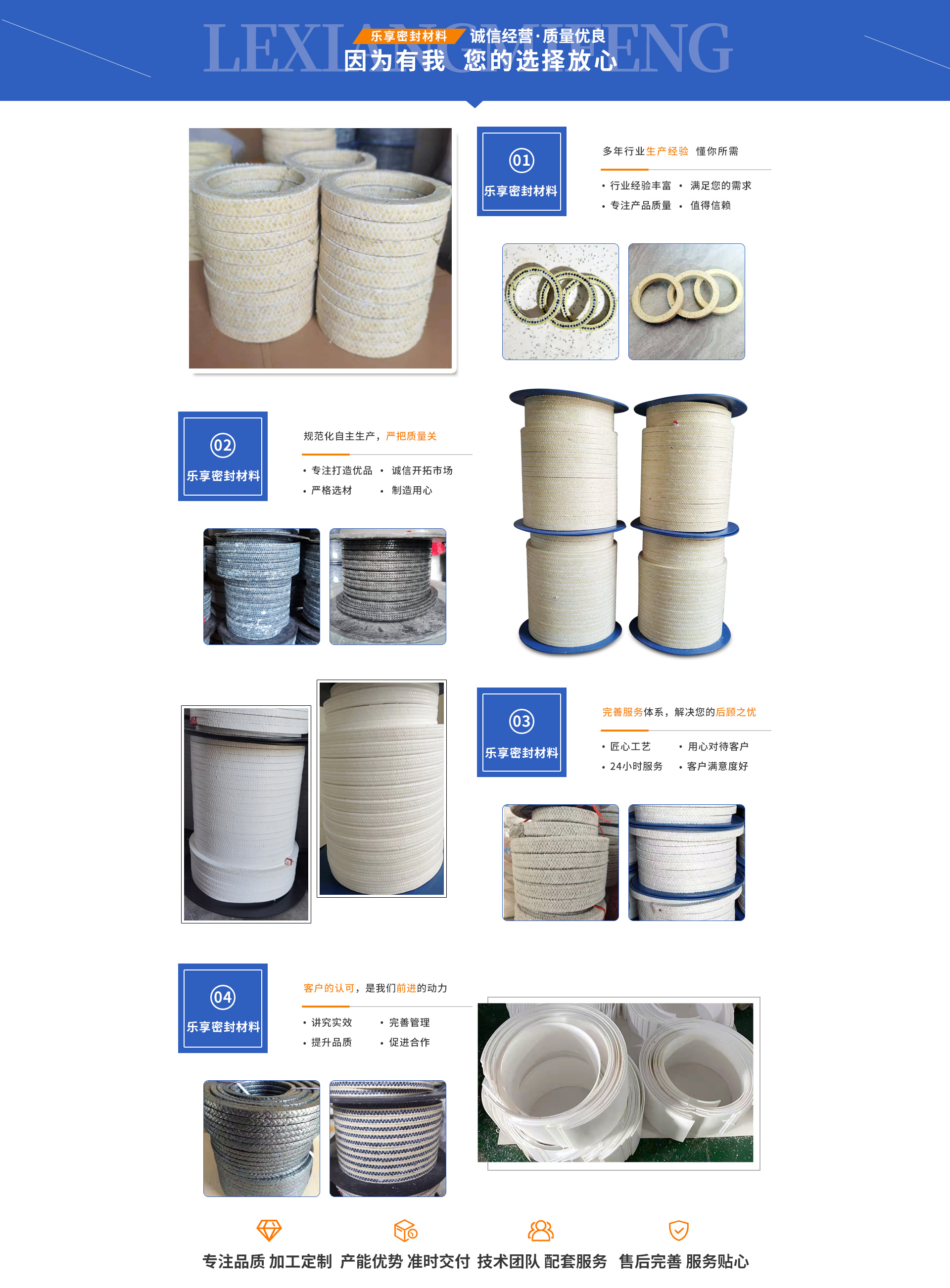 大城縣樂享密封材料有限公司主營:芳綸盤根,四氟盤根,碳素盤根,石棉盤根,芳綸墊片,石棉浸液盤根,芳綸盤根墊片,無油白四氟盤根,含油白四氟盤根,含油黑四氟盤根,石棉含油盤根,芳綸碳素盤根,石棉橡膠盤根,芳綸碳素混編盤根、聚四氟乙烯板(四氟板)等,是生產(chǎn)銷售密封件的廠家,廣泛應(yīng)用于石油、化工、造紙、造船、發(fā)電、冶金等工業(yè)設(shè)備的管道、閥門、法蘭、換熱器等。